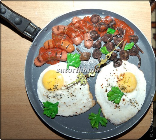 Справа на фото "старая" яичница))))) Делала ее не зная толком как правильно завести соленое тесто, и вообще, я впервые работала с ним. Как видно, лепка-то вроде и удалась, но вот реалистичности нет! Клеила на супер клей, сушила на подоконнике и со временем она потрескалась и отпала. Сковородку подготовила довольно быстро. Проковыряла в ней отверткой 2 отверстия (одно для часового механизма, второе - для петельки, чтобы можно было повесить на стену).